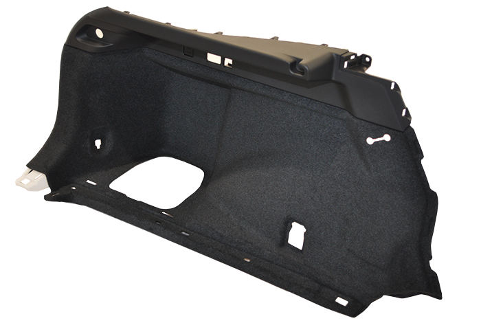 大切な荷物を傷つけることのないよう、布張りで仕上げられたトランクルーム。その布張り部分である内装部品のラゲージトリム、リヤシートとトランクルームの間の仕切りに装着される吸音材のサイレンサー、トランクのない車種の収納スペースであるデッキの内装部品などを製造しています。車室内を快適に保つ吸遮音性能のほか、高級車のトランク内装部品では、毛足の長い表皮材を使用し、車格に合った質感も演出します。