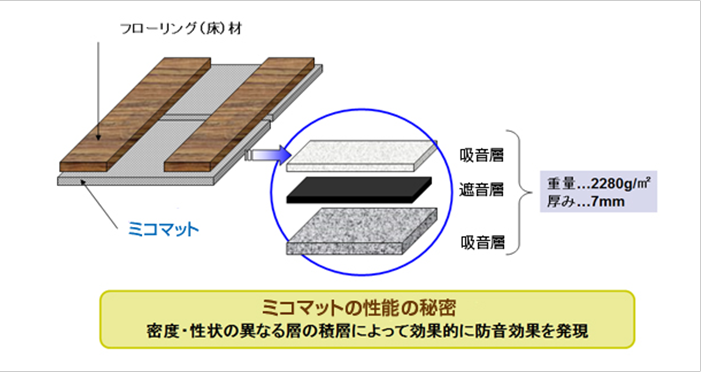 フローリングの下に敷く吸音・遮音材「ミコマット」は、自動車部品で培った当社の材料開発技術から生まれた製品。音に対する特性や密度が異なる2種類の繊維(吸音層)で遮音材をはさんだ構造で、高い防音効果を発揮します。快適な歩行感を生み出す弾性を追求しながらも、軽量で、施工方法も敷くだけと簡単。防カビ性や高い断熱効果も兼ね備えています。集合住宅や二世帯住宅の騒音対策として、手軽に導入いただける製品です。