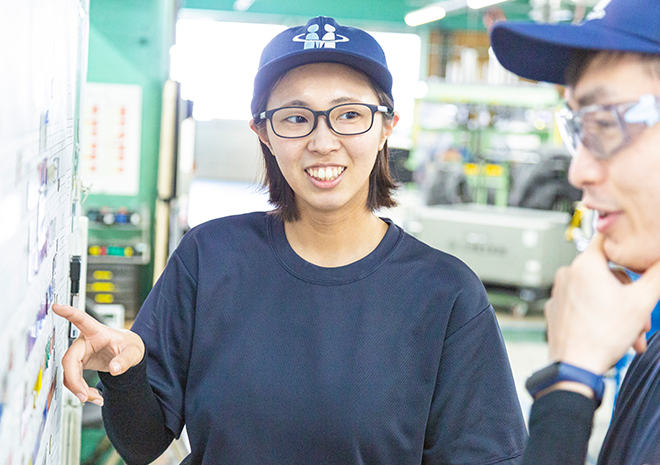 入社して10年ほど経ったころから、班長を任されています。仕事は、本社2階工場の部品組付工程がスムーズに進むための管理。毎日もう1人の班長と打ち合わせて、その日に製造する予定の製品のうち、どれをどの作業者に担当してもらうかを計画し、本人に指示します。お客様の都合に応じて、「この車種の分を、この時間までに」といった順番が決まってきますが、作業者によってスキルの差があり、できる作業が違います。「この時間にこの製品をつくりたいけど、できる人がいない」ということも。どうしようもないときは自分が応援に入るなど、臨機応変に動きます。